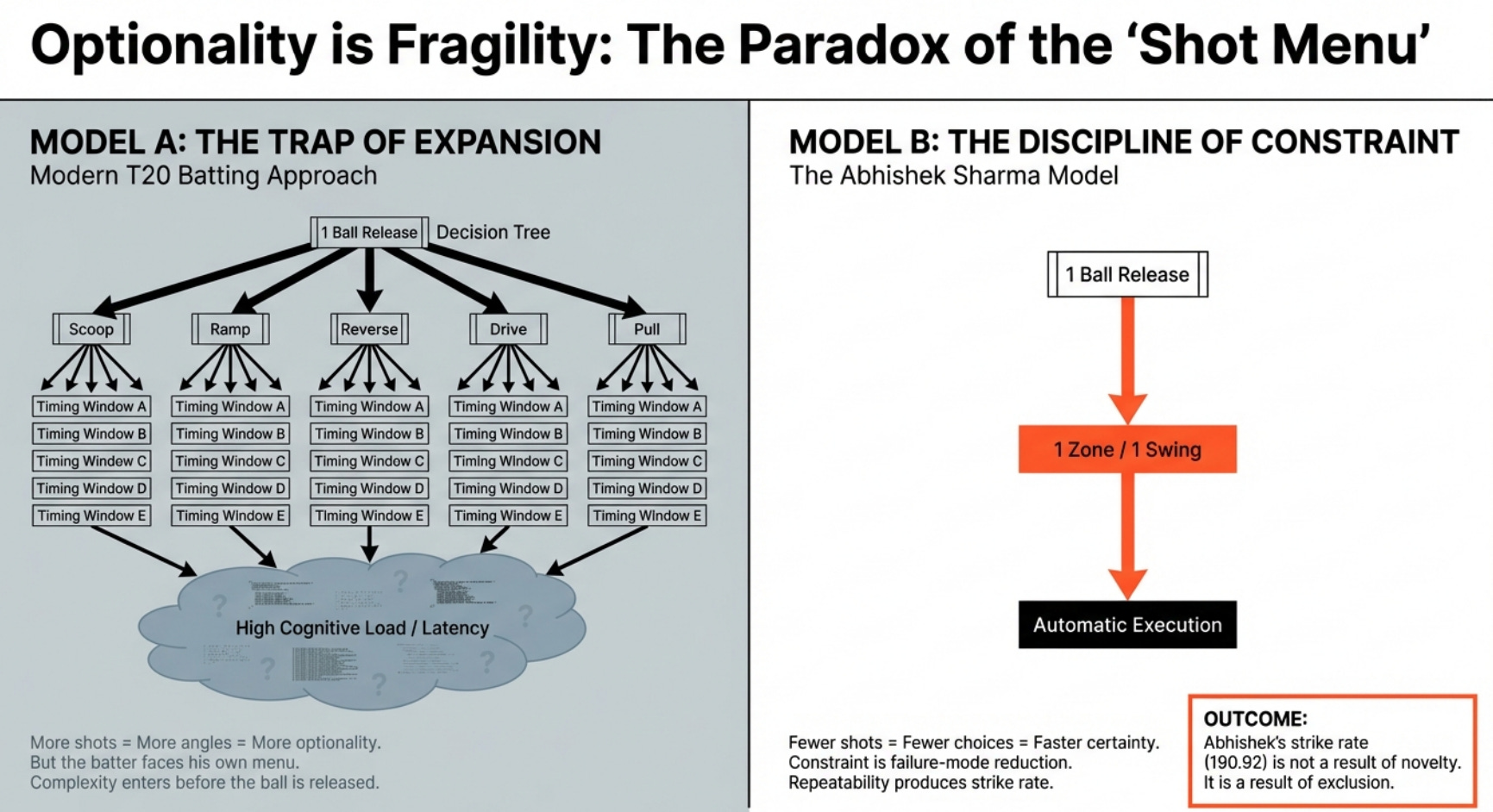 Abhishek does the opposite. He constrains. These are my zones. These are my swings. These are the strokes that will survive pressure. Everything else is forbidden. This is not limitation. This is failure-mode reduction. Fewer shots means fewer choices. Fewer choices means faster certainty. Certainty is what produces speed. Repeatability is what produces strike rate.