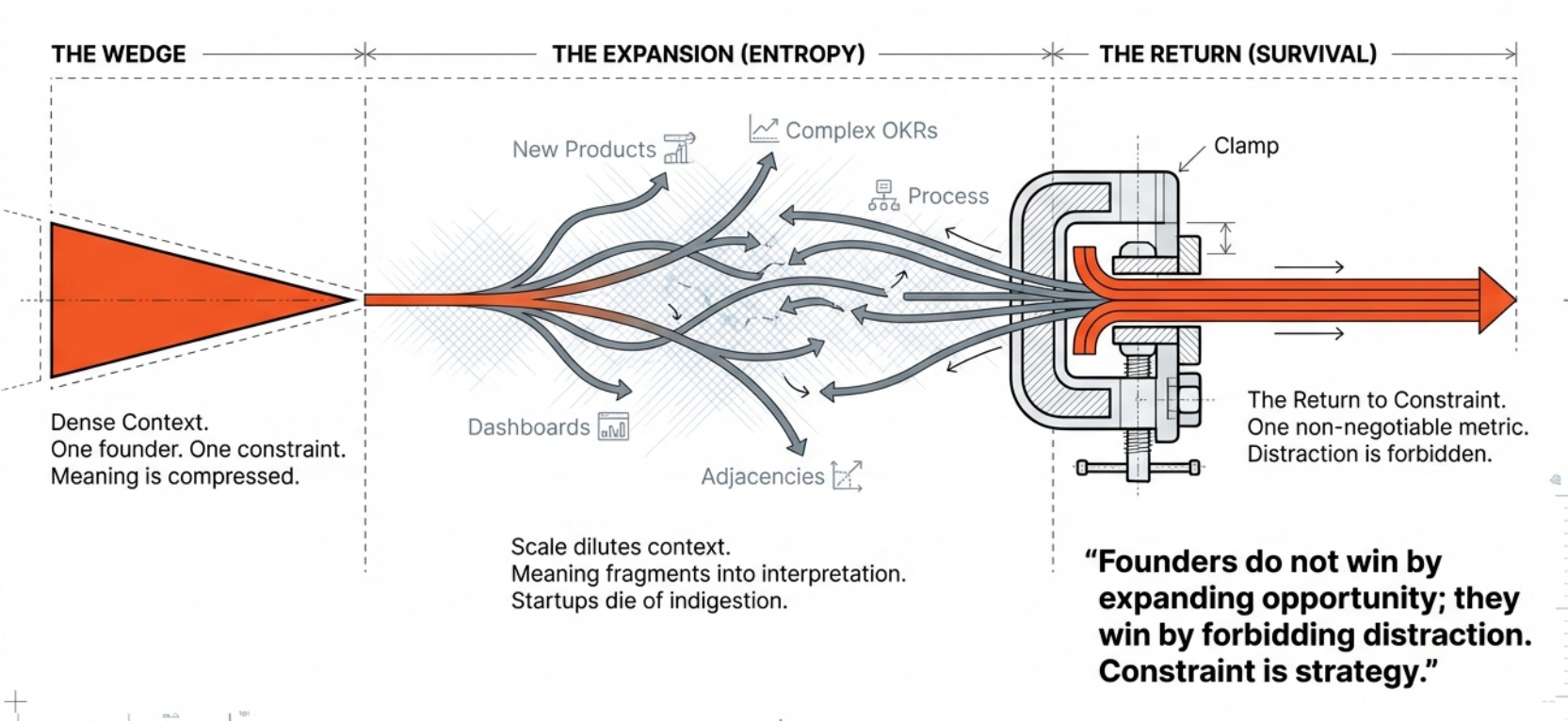 We start adding “New Products,” “Complex OKRs,” and “Adjacencies.” But scale dilutes context. Meaning fragments into interpretation. Startups don't die of starvation; they die of indigestion.