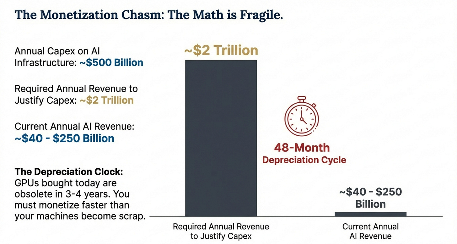 And here is the sharpest contradiction: to justify roughly $500 billion per year of AI infrastructure spending, the industry would have to generate nearly $2 trillion in annual revenue. Current AI-specific revenues are in the tens of billions. This isn’t a gap — it’s an abyss. For today’s valuations to hold, AI revenue would need to grow by eight to fifty times in the next few years — while the hardware being built today depreciates in three to four years.