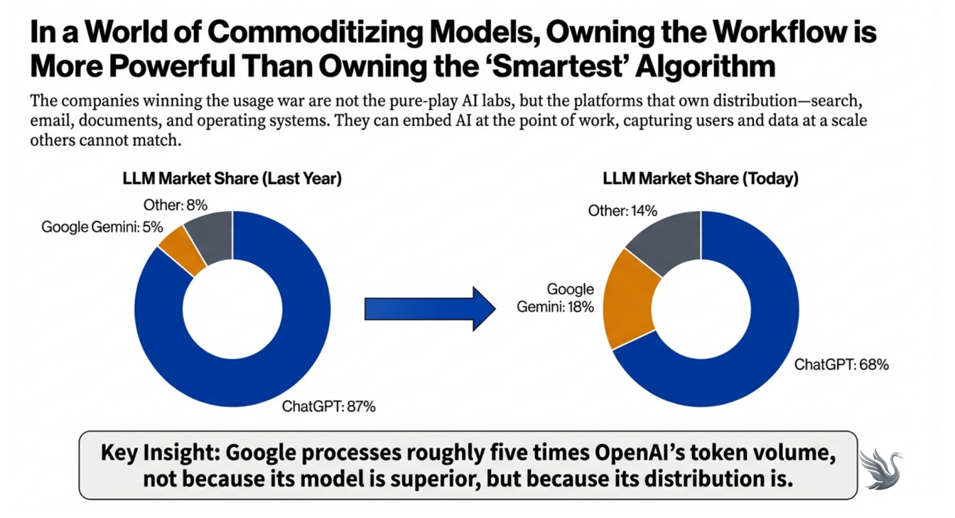 Distribution matters. We are already seeing this with Google. Whoever owns email, search, operating systems, and business software decides which models get traffic. Intelligence flows through pipes, and the pipe owners get paid.