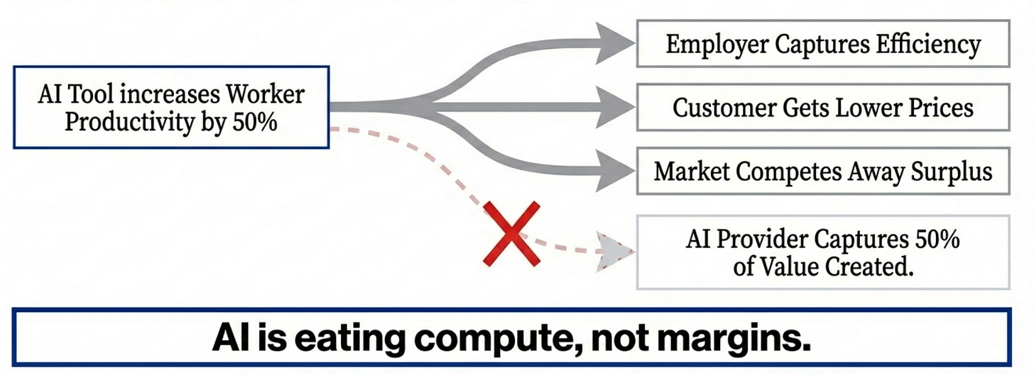 In the SaaS era, software captured the value it created. Customers paid recurring fees for access to tools that locked them in. Unlike the SaaS era where vendors captured value, the economic surplus from AI productivity is diffusing to employers and customers.
