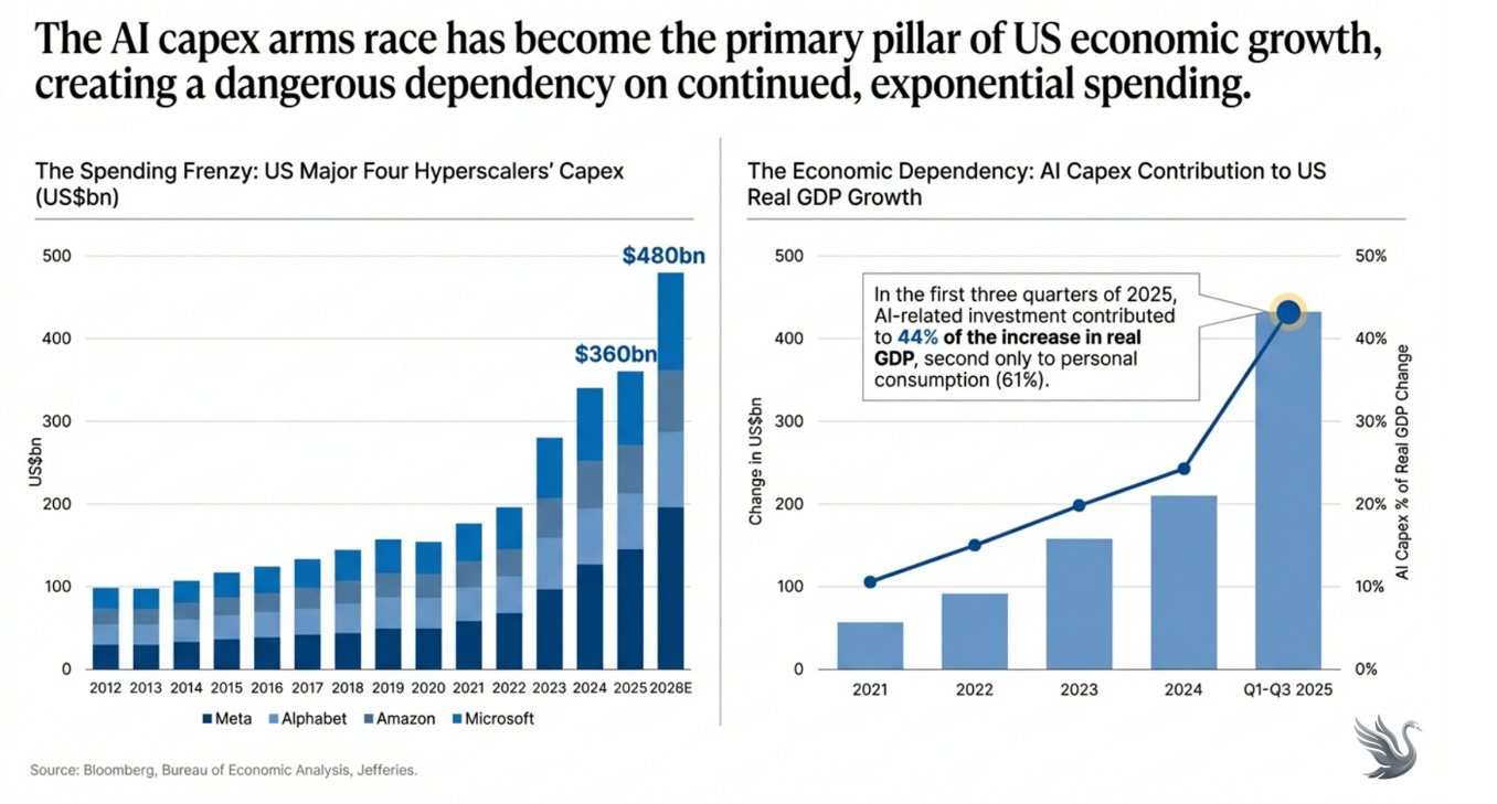 US is structurally dependent on the build phase of AI. If hyperscalers slow their capital spending, GDP doesn’t just decelerate — it sags. The economy has become reliant on chips and servers being bought at scale, even though the earn phase — actual revenue from AI — has barely begun to exist.