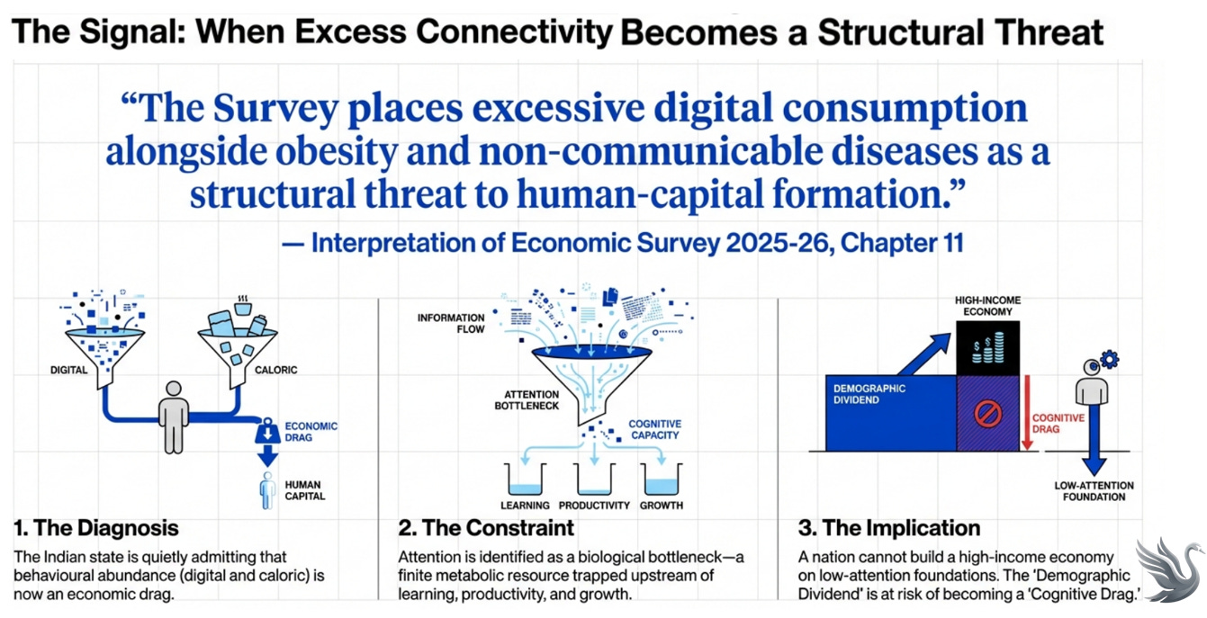And that is why the most haunting signal in the Economic Survey 2025–26 is not a chart on fiscal arithmetic, nor a paragraph on exports. It is a sentence that should stop any serious reader bit cold: the Survey places excessive digital consumption in the same structural category as obesity and non-communicable diseases — a threat not to comfort, but to human-capital formation itself.