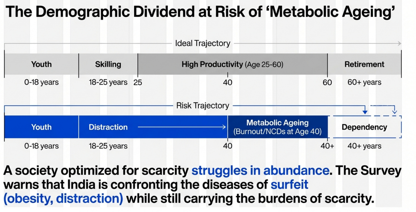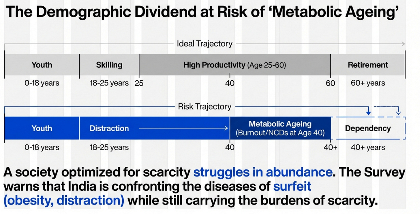 The Survey goes further, pairing obesity and excessive digital consumption — explicitly framed as digital addiction — as a joint structural threat to India’s human capital and demographic dividend.
