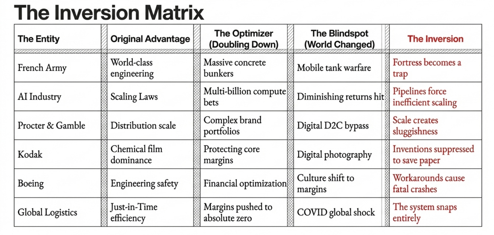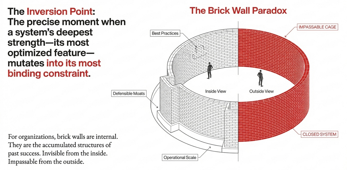 I call this the Inversion Point - that precise moment when a system’s deepest strength—its most optimized feature—mutates into its most binding constraint. It is the point when/where our past successes become the walls of our future prison.