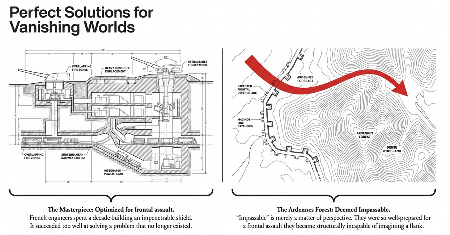 The most sophisticated defensive system ever built became irrelevant not because it failed its design, but because it succeeded too well at solving a problem that no longer existed. The French were so well-prepared for a frontal assault that they became structurally incapable of imagining a flank.