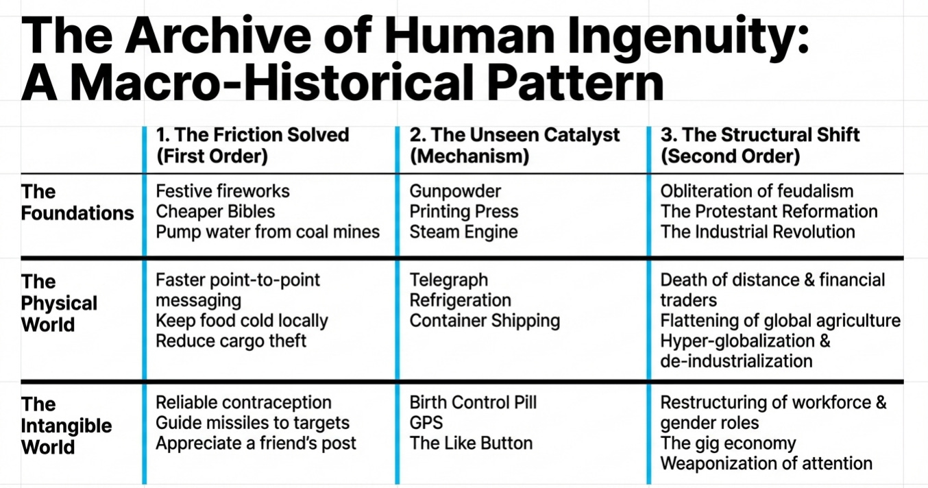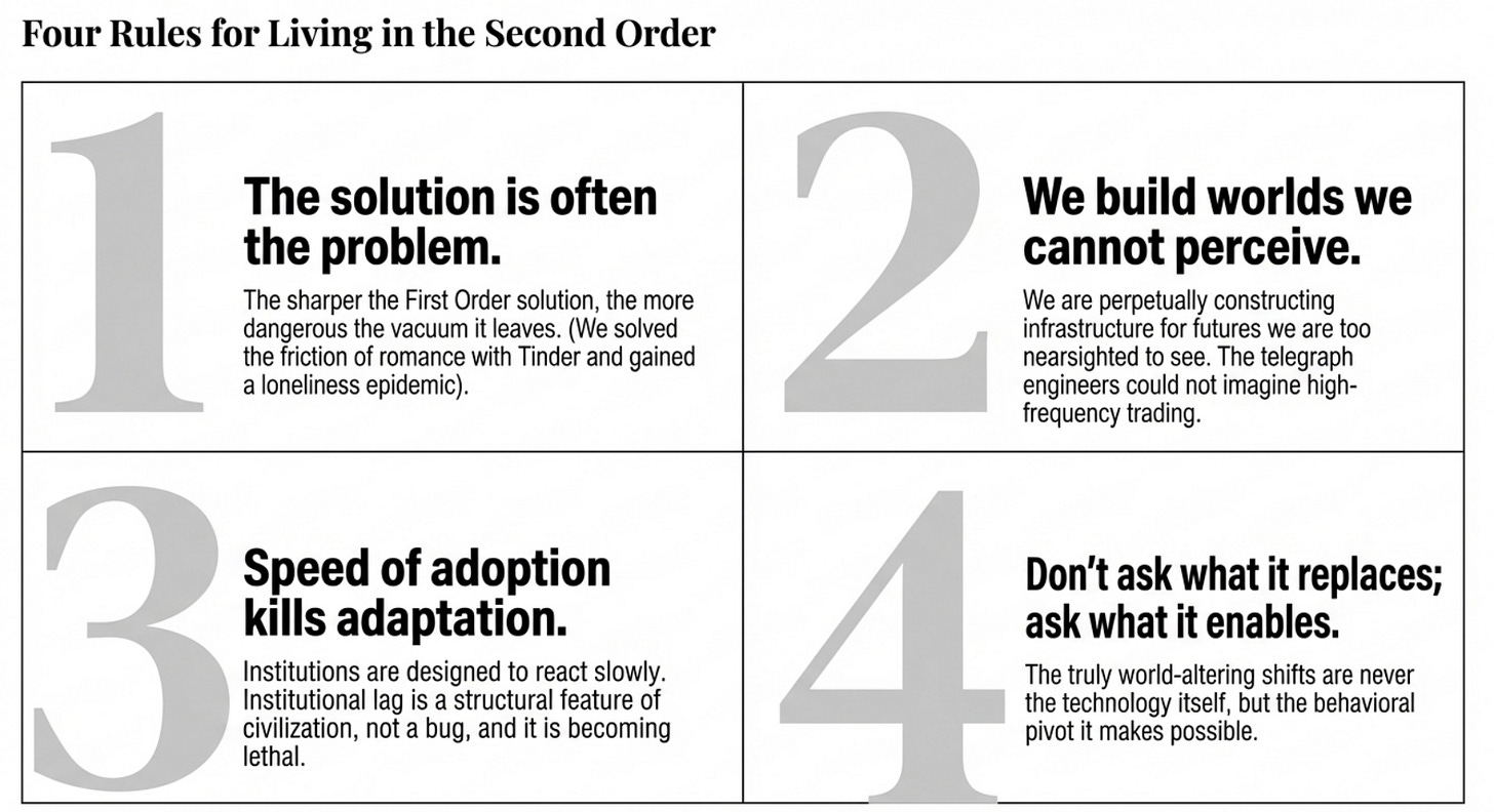 Gunpowder took centuries to reshape Europe. The printing press took a generation. AI is reshaping the labor market in months. The gap between First Order and Second Order is collapsing. Our institutions—governments, education, regulation—are designed to react slowly. They are attempting to regulate a world the telegraph built, while we live in a world the smartphone built. The lag is not a bug. It is a structural feature of civilization. And it is getting more dangerous.
