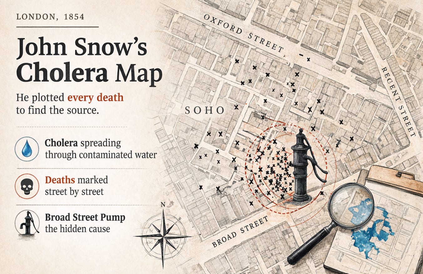 In 1854, a physician named John Snow drew a map. Not of continents or coastlines—but of deaths. Cholera deaths, plotted street by street across London's Soho district. He was trying to solve a drainage problem. Contaminated water. A single pump handle on Broad Street.